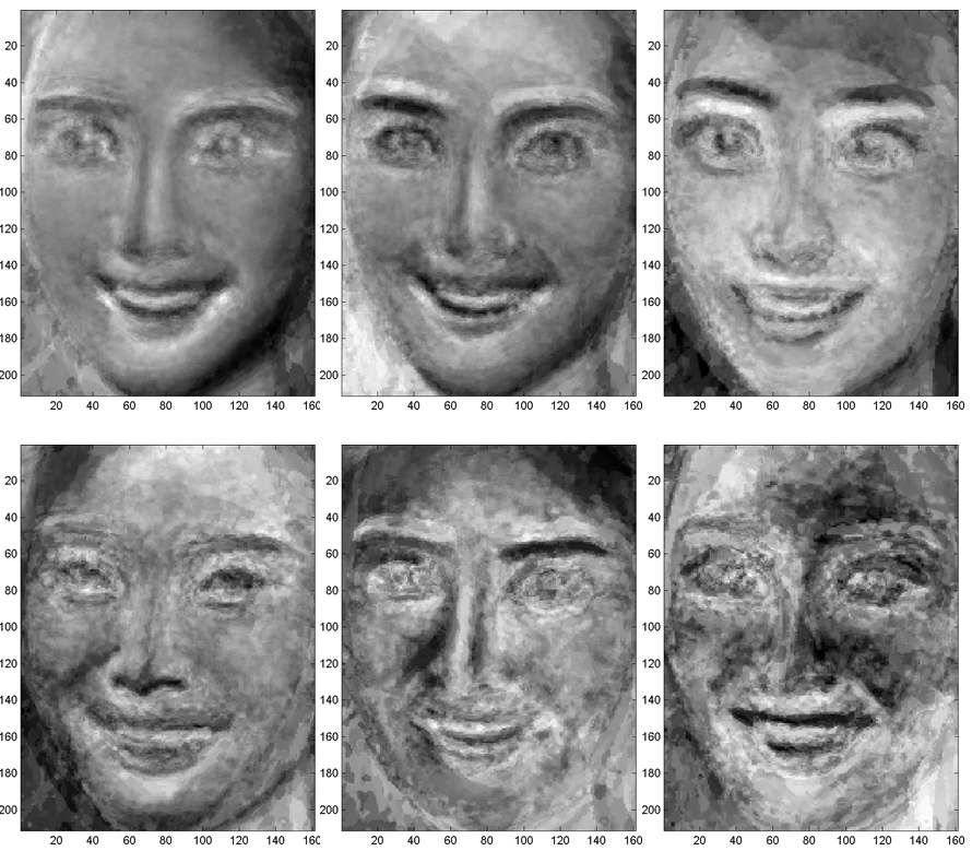 This reminds me a bit of eigenfaces in facial recognition datasets, where you get dark blurs that highlight the most prominent features of a human face -- the eyes, nose, and mouth. The results are usually terrifying images of unsettling faces with deep, dark, sunken eyes and creepy smiles.